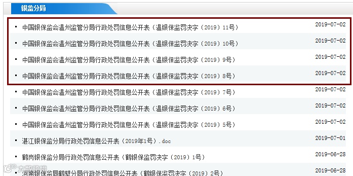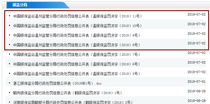 银保监会网站今日公布的温银保监罚决字〔2019〕5号温行政处罚信息公开表显示,温州银行因六宗违法遭罚330万,这也是下半年以来银保监会官网公布的第一张百万元以上银行罚单。