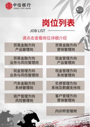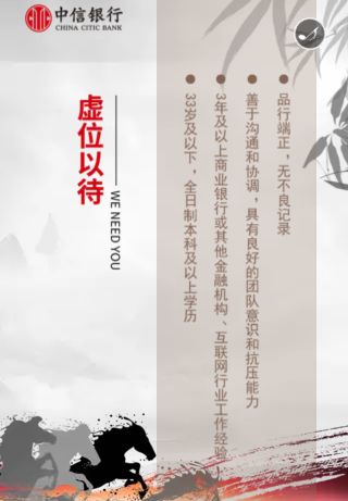 中信是一家以对公业务见长的银行,对公多项业务排名在股份行居首。公司银行部负责中信银行对公客户经营、渠道建设和产品研发,目前正全力推进对公业务二次腾飞转型,加入我们,一起为中信银行公司金融发展写上浓墨重彩的一笔!