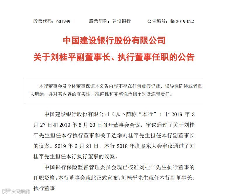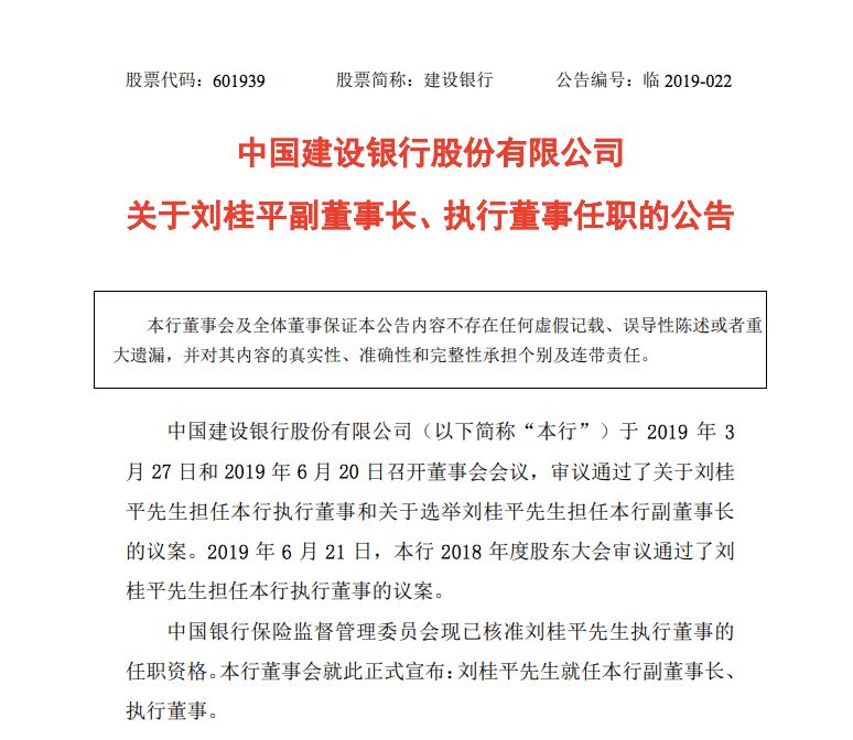2019 年 6 月 21 日,建行 2018 年度股东大会审议通过了刘桂平担任执行董事的议案。中国银行保险监督管理委员会现已核准刘桂平执行董事的任职资格。建行董事会就此正式宣布:刘桂平先生就任建行副董事长、执行董事。