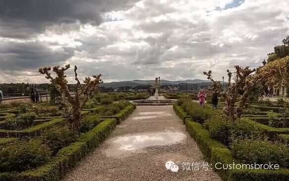 从走廊尽头的楼梯上到楼上一层,由近及远排列着十余间大小不一、装饰风格各异的房间,这应该就是每一位皇族成员的卧寝了。近处几间较小的,装饰略显简单的屋子可能是皇族外亲包括一些贴身仆人们住的;往里走是几间铺着鲜红的地毯,放有巨大的梳妆台和老式钢琴的房间,这应该是留给公主们的闺房;旁边装有精致的壁炉,壁炉上放着各种银质的酒杯,书架上摆满不同文字的泛黄古籍和白色的羽毛钢笔的应该是王子们的房间;最深处那间最大的屋子就应该是为这个家族实际的掌权人以及他的妻子准备的,每个墙角都雕有精致的小天使浮雕,墙上和天花板上的壁画也都五颜六色精巧异常而且多出自名家之手,那个床头雕刻着上千朵金色花朵并用四根金色的柱子挂起蚊帐的大床尽显奢华;这间房还有个小的里间,没有灯,只点着很多小蜡烛,中间的大理石台柱上摆放着一个耶稣受难的十字架,边上还有一本圣经,很明显这是皇族们每次做礼拜的地方。不同家族不同王室的皇宫在意大利每一个大城市都可寻到,波波利家的皮蒂宫算不上最大的,更算不上最奢华的,可它却另有一处不同寻常且声名远播的地方——波波利花园,在全意大利它都是数一数二的一座园林,也可以说是我这次整个亚平宁之行最意外的收获。