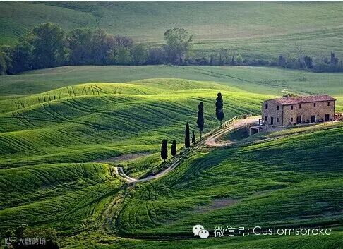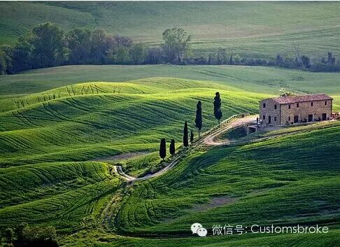 托斯卡纳的平原处在四周崇山峻岭的环抱当中,因此即便地处内陆但却气候温和,阳光充足,风不凛烈雨不迅疾,怕是连上帝都不敢打搅这里浓厚的艺术气息。铁路在大平原上纵横交错,坐在飞驰的列车中就能饱览托斯卡纳一望无尽的乡村风光。黄绿相间的田野里,一排排葡萄架整齐地列队欢迎着远方的来宾,眺望天际尽头是一片树林,在秋末的阳光下,树叶穿着金色的外衣,好像把大地都铺上了一层金色的地毯,树林里星星点点隐藏着几处人家,烟囱中升起的炊烟和那空中朵朵洁白的浮云化为了一体,不时地有各种羽毛艳丽的鸟儿从林中飞出,给这幅迷人的田园画作再增添些许活力。