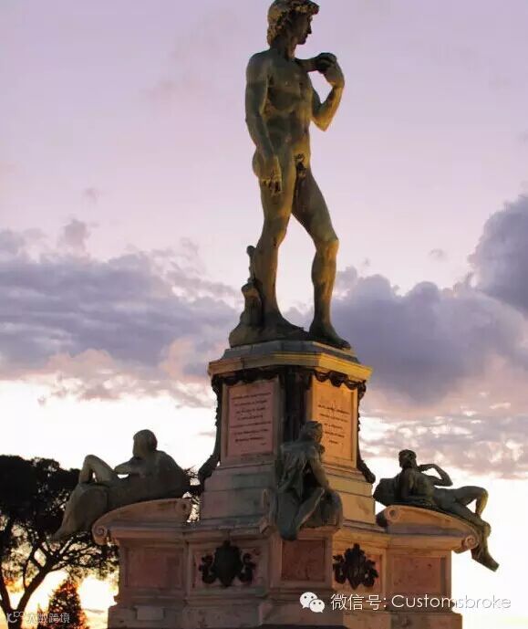 晚霞斜照,金色的太阳已经踏上了回家的旅途,河畔的街灯早已点亮,小巷里狭窄崎岖的石板路上几片落叶被一阵风吹向空中,找寻着下一站归宿。阿诺河依旧静静地流淌着,留下对这座城市的一声轻轻咏叹,带着些许眷恋向西奔向火红的天际。大卫站在河边的山顶上,余晖下的背影更显高大俊俏,他注视着眼前消逝的水流,期待心中的那位美丽佳人能与他邂逅在这米开朗琪罗广场之上,夜色降临之前,他终于等到了,眼前的佳人,就是河对岸那座温婉动人的城市。如果你也能有幸到河畔丘陵上的米开朗琪罗广场前欣赏翡冷翠的日落,眼前的画面绝对让你永生难忘。大卫的雕像(当然是复制品)屹立于广场中央,每一天、每一分、每一秒,阿诺河水伴随着时间的脚步慢慢流走,而他目光注视下的这座城市,依旧有着如初恋情人一般青春动人的面庞,晨雾里,旧宫的钟塔依旧挺拔秀丽,夕阳下,圣母百花大教堂的穹顶依旧妩媚娇羞。我也愿做你的大卫,化身雕像,立于天地之间,为你扫清尘霾,默默守护你走过每一个日升日落的轮回,即使再过上百年千年,我依旧能这样静静地看着你美丽的倩影,那将真心是我一生最大的幸福!