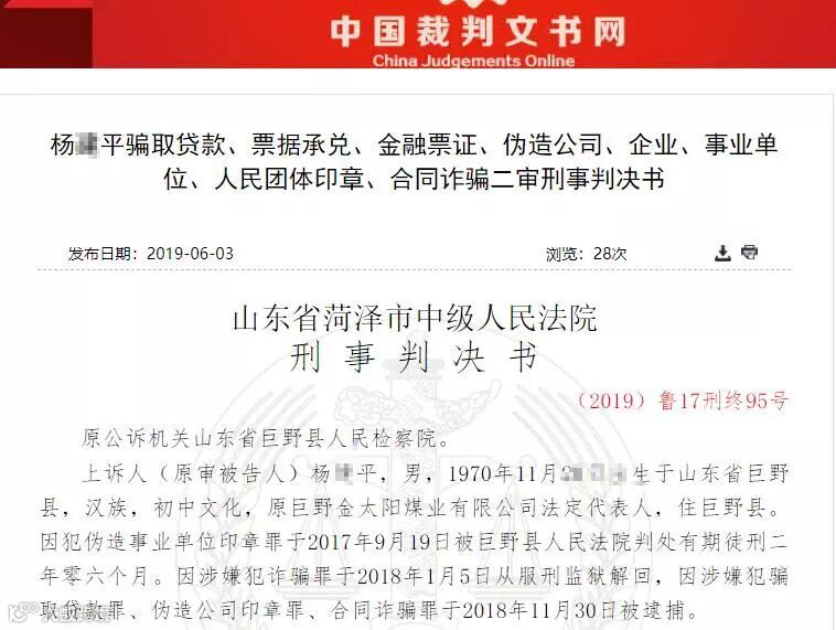 最终,杨某平因骗取贷款罪,被判处有期徒刑6年,并处罚金30万元,犯合同诈骗罪,被判处有期徒刑15年,并处罚金50万元,结合此前伪造事业单位印章罪的有期徒刑2年6个月,菏泽市中级人民法院判处杨某平有期徒刑19年,并处罚金80万元。