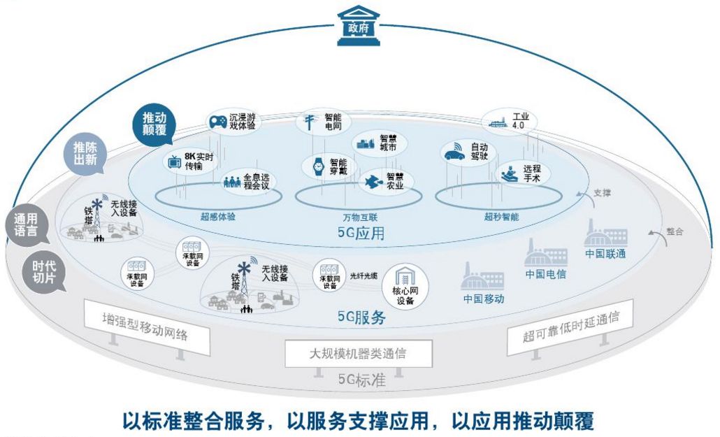 而建立在5G标准上的是5G服务层。由通信网络设备商和电信运营商组成。这两大类企业通力合作为全社会提供元线通信服务。通信网络设备商包括组成核心网的5G设备、组成承载网的光传输设备和天线、基站、光纤等元线接入设备的生产商。这些通信行业企业在标准的指引下推陈出新。共同建设满足5G技术目标的服务基础设施。最终提供符合能够支撑颠覆现有通信应用的整体通信服务。