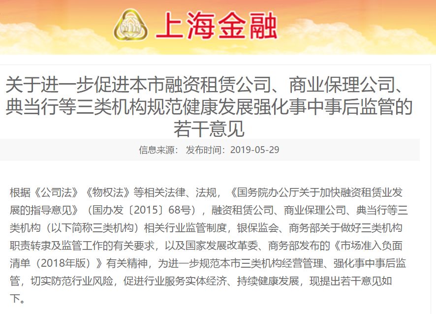 根据《公司法》《物权法》等相关法律、法规,《国务院办公厅关于加快融资租赁业发展的指导意见》(国办发〔2015〕68号),融资租赁公司、商业保理公司、典当行等三类机构(以下简称三类机构)相关行业监管制度,银保监会、商务部关于做好三类机构职责转隶及监管工作的有关要求,以及国家发展改革委、商务部发布的《市场准入负面清单(2018年版)》有关精神,为进一步规范本市三类机构经营管理、强化事中事后监管,切实防范行业风险,促进行业服务实体经济、持续健康发展,现提出若干意见如下。