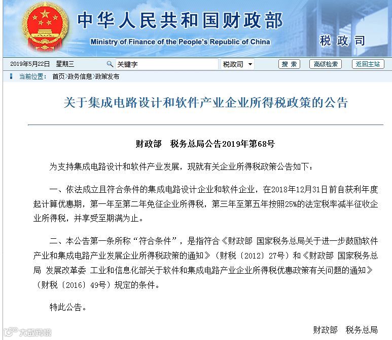 财政部、税务总局最新发布《关于集成电路设计和软件产业企业所得税政策的公告》。公告称“为支持集成电路设计和软件产业发展”,将宣布自2018年12月31日计算优惠期,对符合条件的企业实行企业所得税减免政策,前两年免征,随后三年减半征收企业所得税。