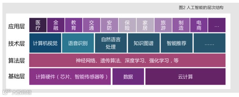 当前人工智能技术在很多产业和领域中已经得到广泛应用,人工智能产业化发展的地形已经初现端倪。从产业角度看,人工智能技术按照结构划分为基础层、算法层、技术 层和应用层。