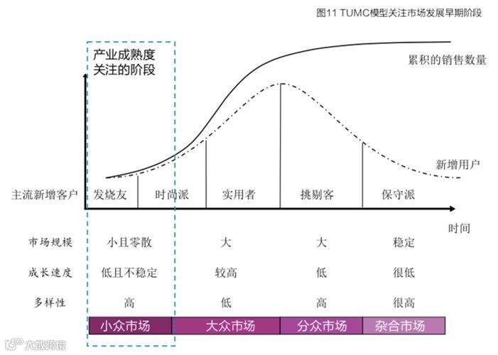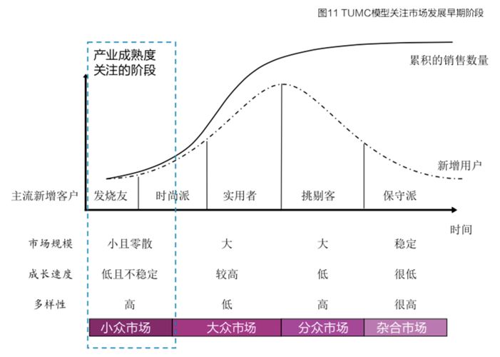 战略节奏理论将产品市场的发展分为小众市场、大众市场、分众市场和杂合市场4个阶段。AI技术应用处在“尚未进入小众市场”到“即将开启大众市场”的阶段上。