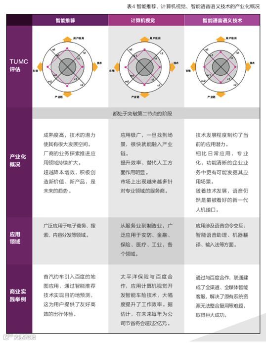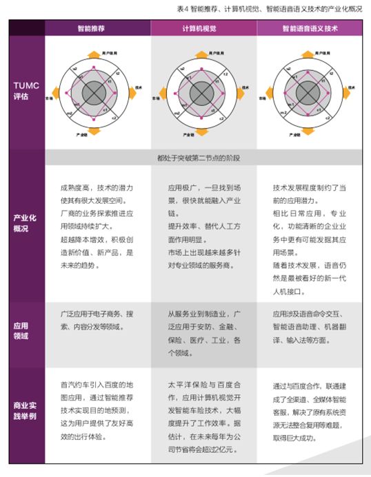 智能推荐、计算机视觉、智能语音语义等AI的主要热点技术目前的产业化成熟度较高。这些AI相关技术与产品能够很好地融合到已有产业链中,新的产业要素和产业链结构正在形成。
