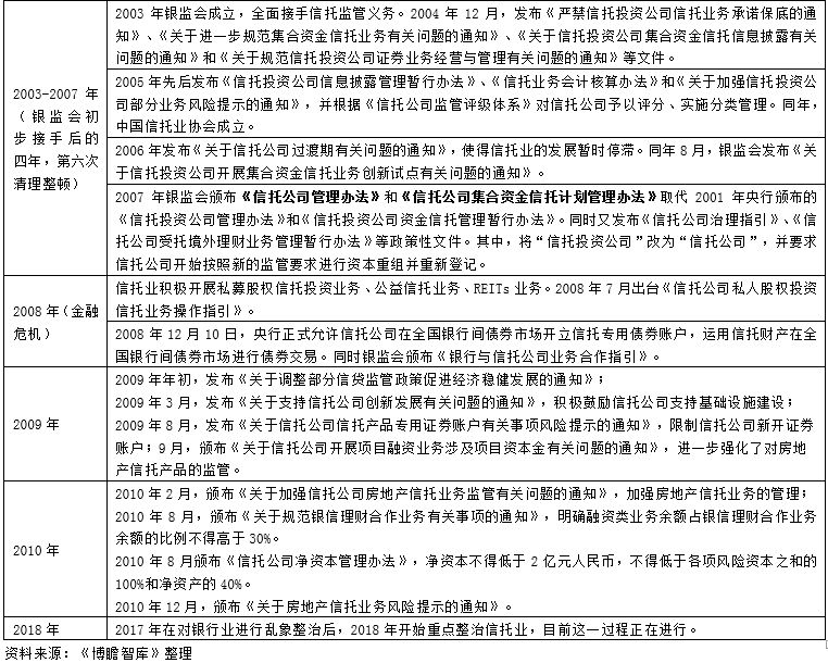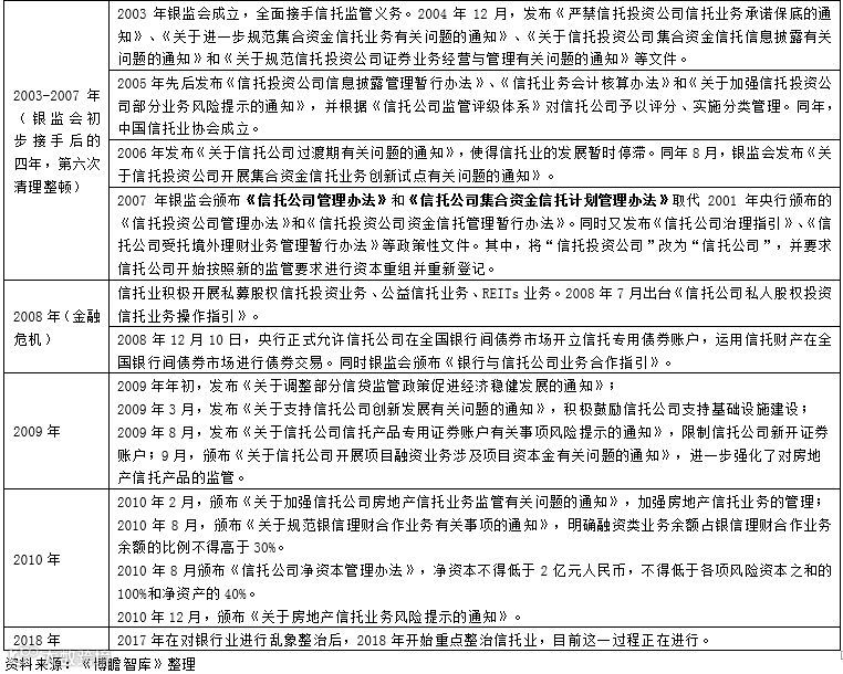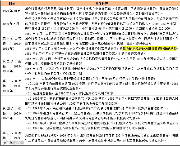 2、2001年之前,由于我国一直没有一部统一的信托法(2001年发布、因此2001年是一个重要的时间点),导致我国信托业发展一直比较乱,仅2001年之前信托业便经历五次大整顿,2007年为第六次大整顿,目前也可以说信托业仍然处于整顿阶段。
