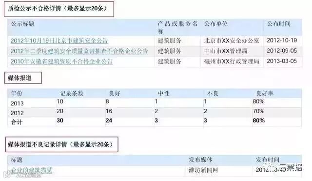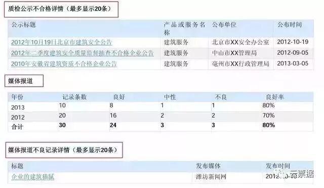 该模块主要体现了行业协会、工商税务及各类媒体等方面对于目标公司进行的评价、奖励、惩罚、检测等,其中涉及的负面信息可以直接体现目标公司存在的风险,如产品质量风险,企业经营风险,高层管理风险等。
