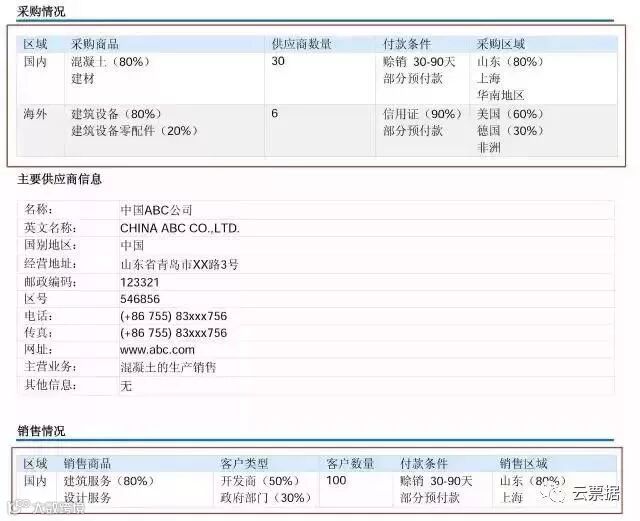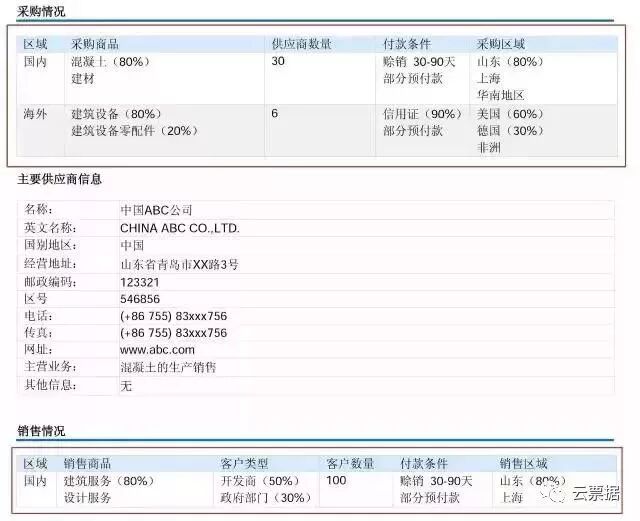 采购和销售信息这两大模块体现的是目标公司的上下游信息,涵盖了目标公司的付款方式、上下游的企业类型、数量、区域等内容。通过信用视界的报告分析师跟上下游企业进行沟通,还可以从侧面了解目标企业的付款情况、交货情况、产品质量等,进而获取目标企业在部分供应商中的信用情况。