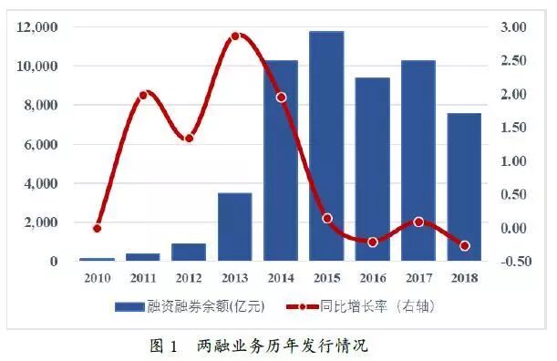 融资融券规模近年来经历了高速增长,2013年两融规模增长率达到287.11%,随后增速放缓,2015年两融余额规模达到了11742.67亿元,2016年有所回落。2017年两融余额规模回升,2018年规模进一步回落,市场规模落在7557.04亿元。