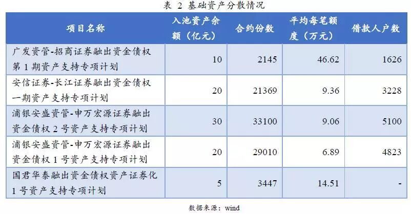 作为基础资产的筛选标准,不少证券规定同一融资客户名下纳入专项计划基础资产的未偿融资合约本金合计不超过专项计划募集资金总额的5%。从已发行两融债券ABS来看,公开披露信息表明入池基础资产的合约笔数较多,平均单笔占比远远少于证券规模的5%,债券分散性良好,集中度风险较低。