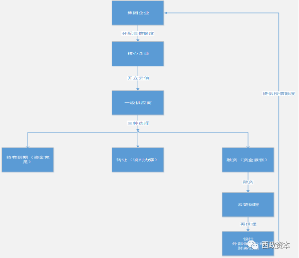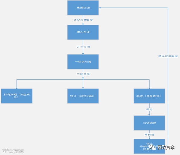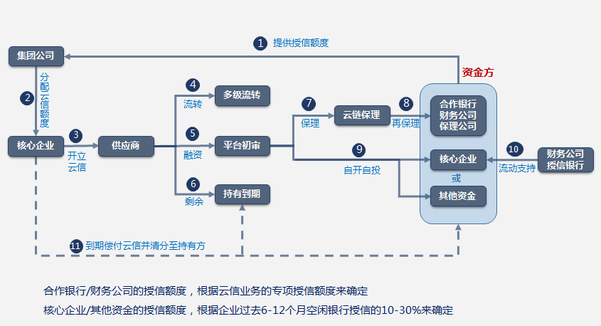 3.核心企业所属集团分配给其旗下核心企业云信额度(云信的本质为核心企业所负供应商拥有的应收账款)。