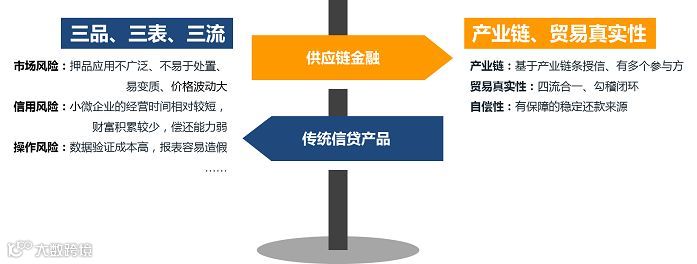 互联网供应链金融的风控则站在产业链整体角度评估, 将供应链中相关企业作为一个整体,基于贸易真实性给予产业链授信,注重资金闭环、四流合一,通过技术手段大幅降低运营成本,所以能够将资金有效注入到供应链中,为相关中小企业提供了灵活、全面的金融产品和服务,是金融体系的有力补充。