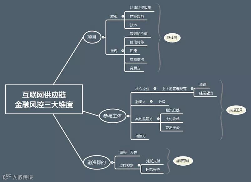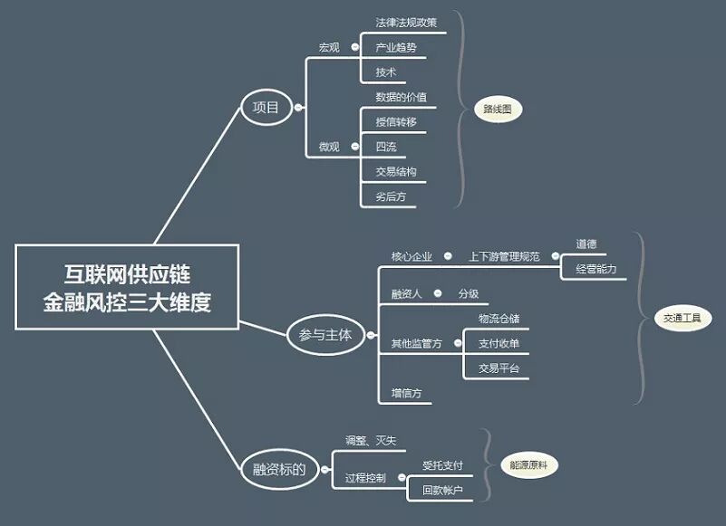 如果以一个互联网供应链金融项目过程为例说明的话,从项目前期立项到后期资金落地运作的风控要点可以归纳为“项目整体、参与主体、融资标的”这三个主要维度。