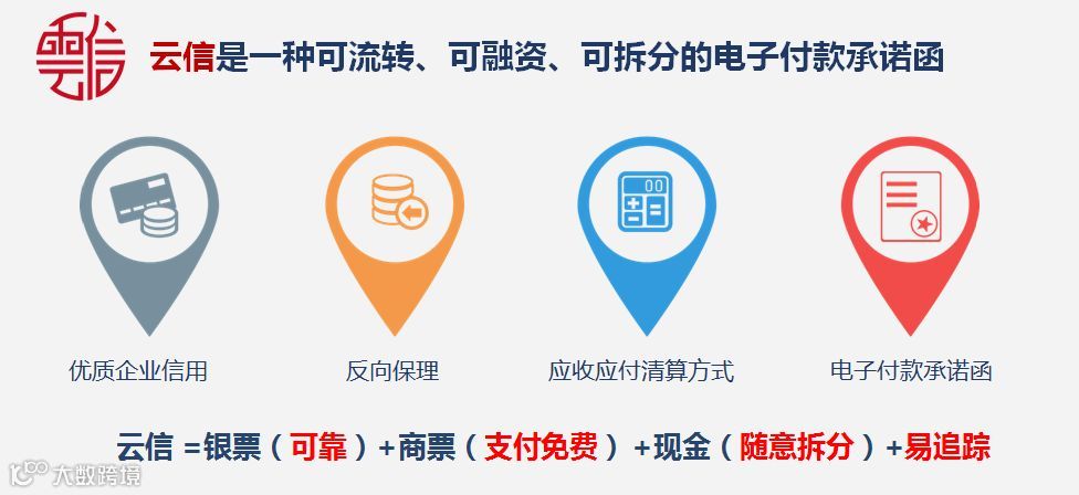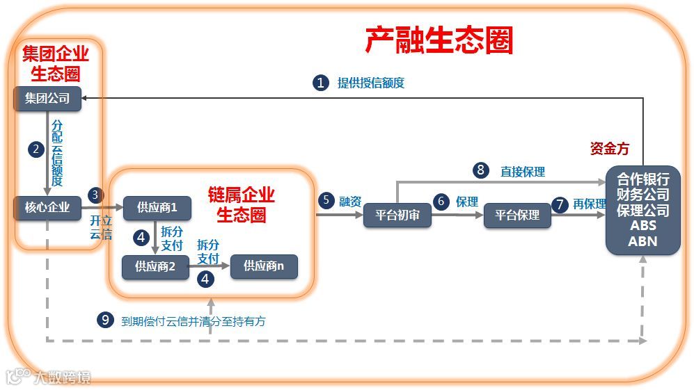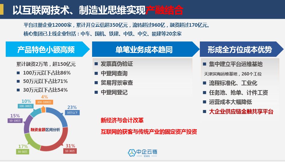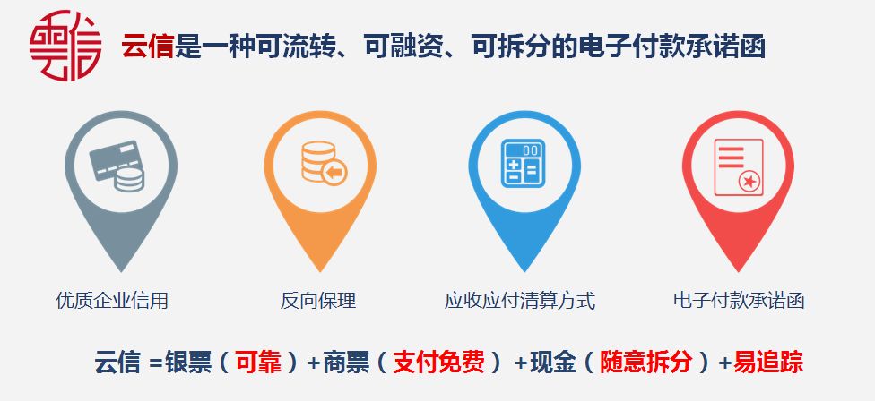 产业链大企业被动确权到主动确权。为充分盘活银行等金融机构给予核心企业的授信和资金支持,发挥核心企业在实体经济中的行业领军地位和优质信用,中企云链在严格遵循国家法律框架基础上,以互联网思维,结合反保理应用实践,创新推出“云信”产品(一种可拆分、流转、融资的电子付款承诺函,其实质是基于真实贸易的企业应收应付债权凭证),为企业间应收应付往来款清理提供新选择。