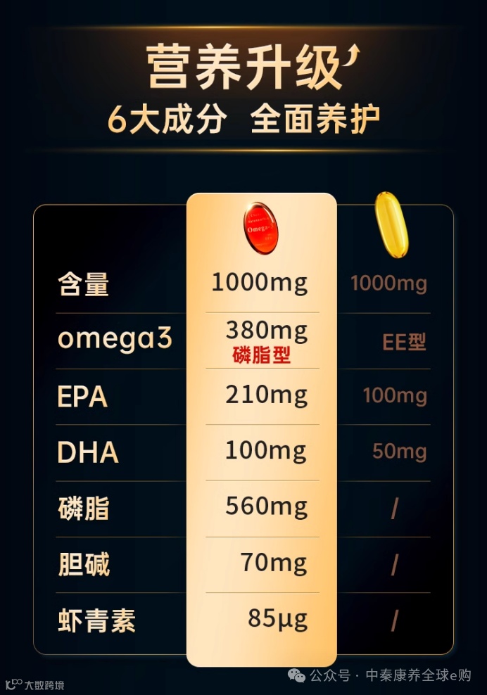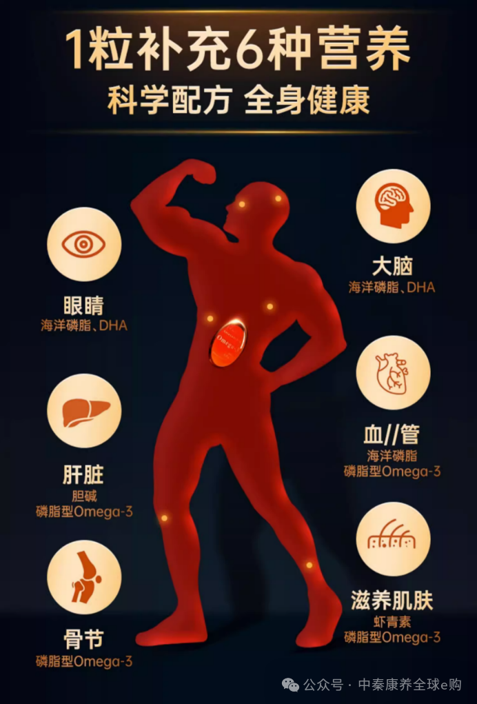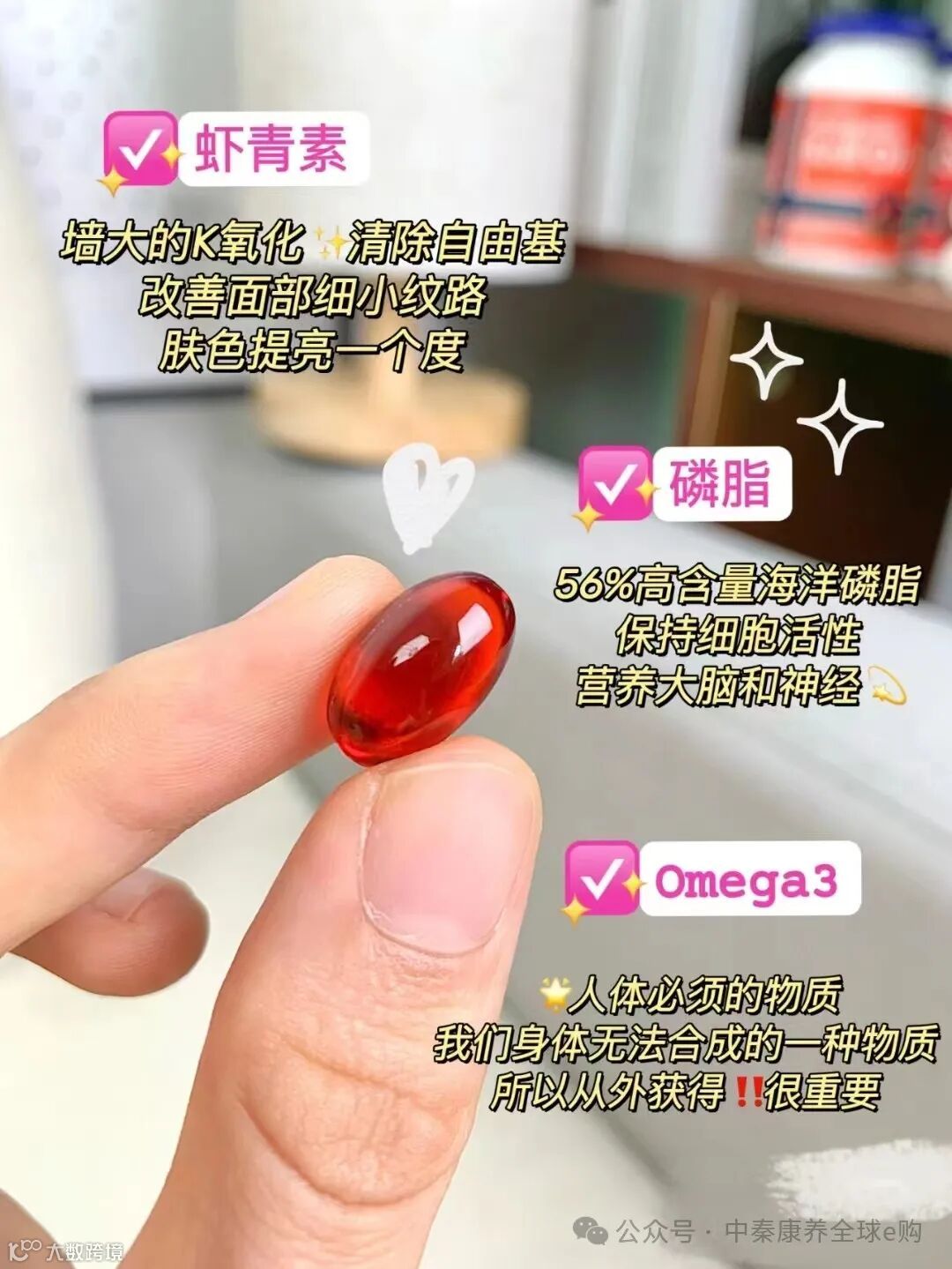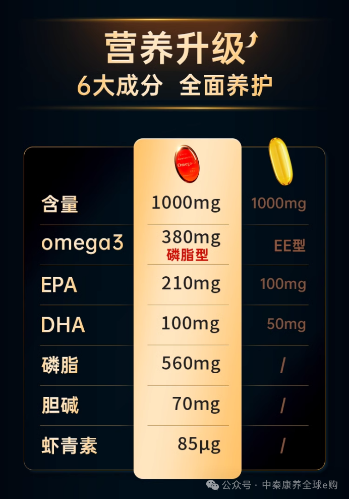 磷虾油比鱼油多了磷脂、胆碱、虾青素三种营养,1粒补充6重营养,科学配方,营养更全面,守护全身健康,同时也能满足更多人群的需求。