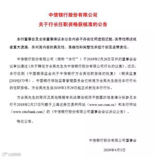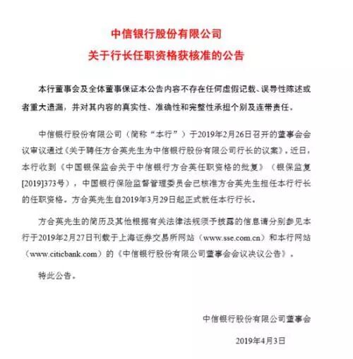 中信银行4月2日晚间发布公告称,本行收到《中国银保监会关于中信银行方合英任职资格的批复》(银保监复[2019]373号),中国银行保险监督管理委员会已核准方合英先生担任本行行长的任职资格。方合英先生自2019年3月29日起正式就任本行行长。