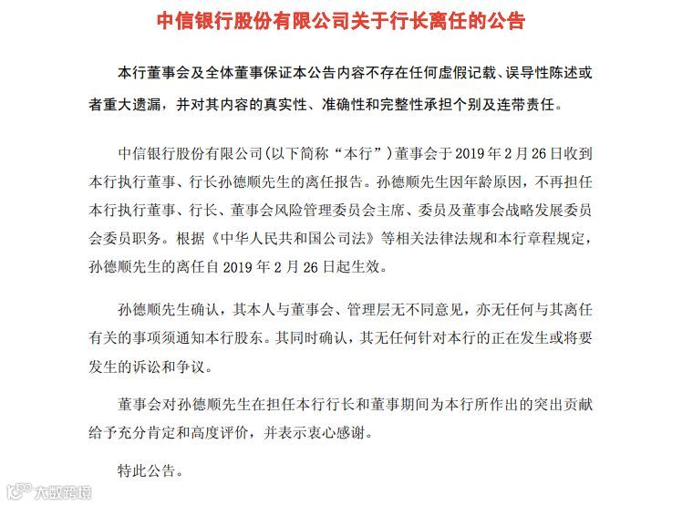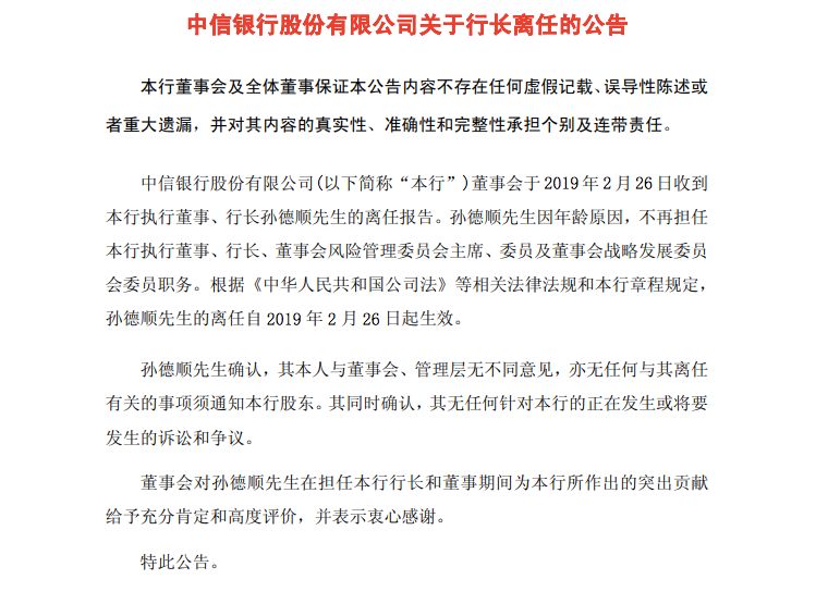 中信银行日前发布公告,于2019年2月26日收到了该行执行董事、行长孙德顺的离任报告。孙德顺先生因年龄原因,不再担任该行执行董事、行长、董事会风险管理委员会主席、委员及董事会战略发展委员会委员职务。