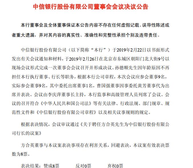 中信银行公告,行长孙德顺因年龄原因离任,董事会同意聘任方合英为行长。