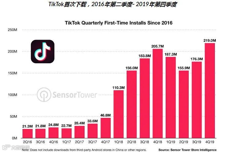 TikTok截止2019年总下载量超过15亿次,而在2019年的下载量为7.38亿次,占总下载量的44%。从各项数据来看,TikTok毫无疑问的正在占据海外市场并得到大众的喜爱。