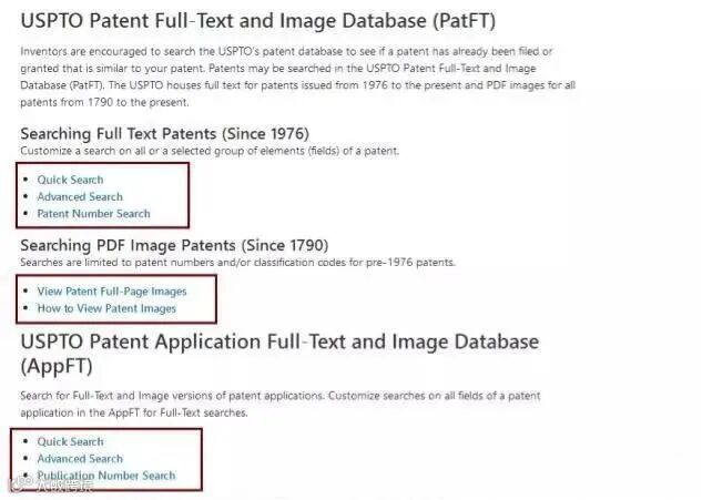 美国专利局提供了1790年至今的美国专利和2001年后公开申请案的线上查询,其中1790-1975年的专利由于只有图像文件(TIFF格式文件),因此只提供专利号和美国专利分类号的检索。