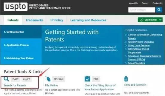 登录美国USPTO:http://www.uspto.gov/ ,点击【Patents】,在Patents页面下,点击【Searchfor Patents】,如下图: