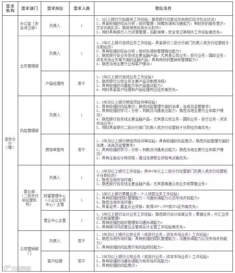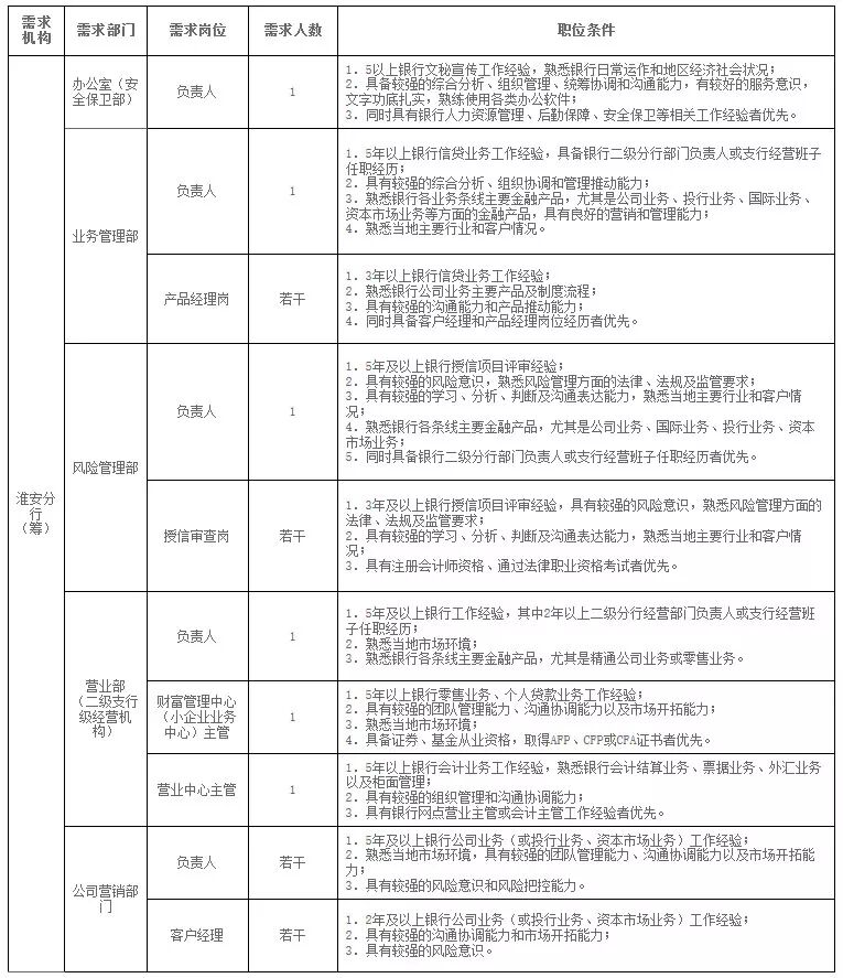 经监管机构及上级机构批准,现我行拟于淮安地区筹建二级分行,现面向社会诚聘金融人才,我们将为每位加盟的员工构建良好的职业生涯发展规划,提供业内具有竞争力的薪酬福利待遇,热忱欢迎有志之士和专业人才加入。
