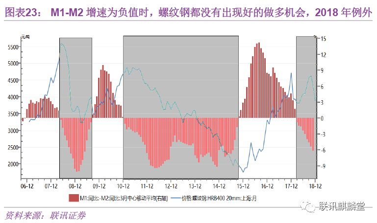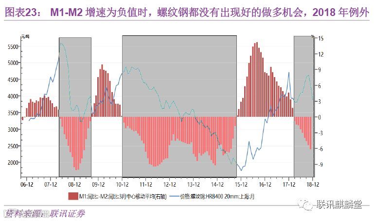 由于地产是黑色系商品的主要需求,因此M1-M2同比增速差往往也预示着商品的行情变化。如图22所示,以螺纹钢为代表,我们可以发现,在三次M1-M2同比增速差值跌入负值区间时,螺纹钢都没有出现过牛市行情。前两次是单边的下行,最近的一次由于供给端受环保限产和供给侧改革的影响,波动比较大。