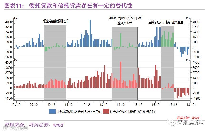 比如2010-2011年和2014-2015年,受银(保)监会要求银信合作计提资本与127号文影响,信托业务受阻,大量需要放款通道的资金转向了银行,使委托贷款出现了高增。