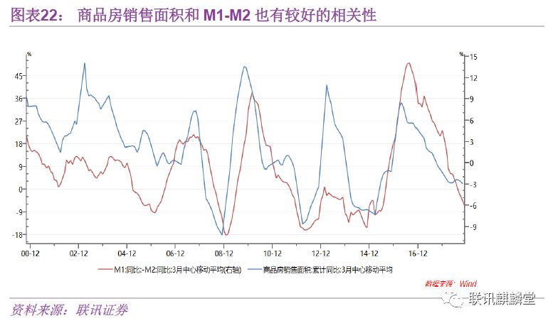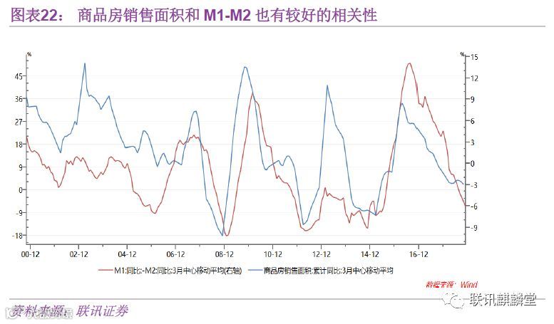 除此之外,房地产销售转好也会导致M1-M2同比差值扩大。在一手房认购时,居民部门购买开发商新盘,实际等同于居民部门的储蓄存款(M2)转向了企业部门的存款。尤其在地产销售转好的同时,如果开发商对未来楼市预期乐观,可能有购地的动作,那么由居民储蓄存款转来的企业存款大概率会以活期形式沉淀在企业活期账户上,也就是M1了。