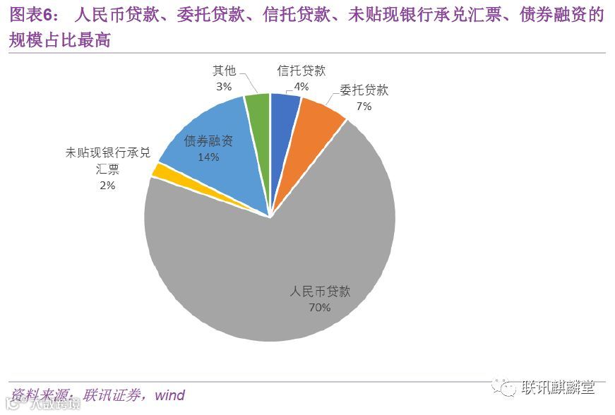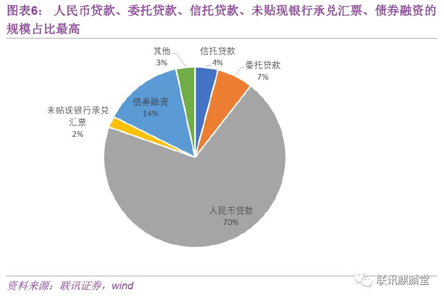在这十二项中,人民币贷款、委托贷款、信托贷款、未贴现承兑汇票和债券融资五项是其中单项占比较高、波动较大的类别,影响较大。因此当我们对某一个月的社融数据进行分析时,我们主要分析的也是这五类。