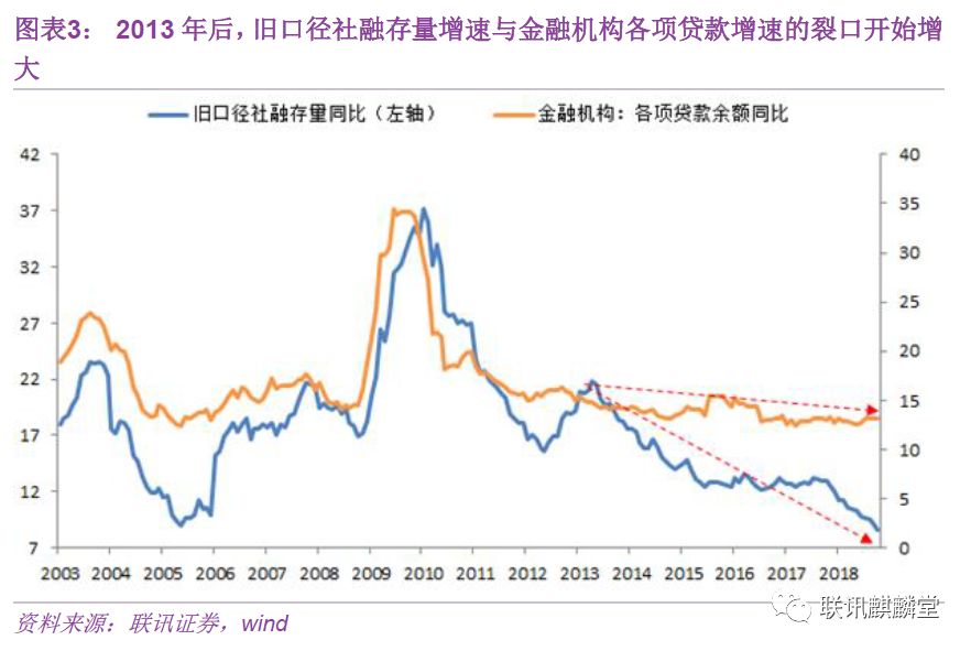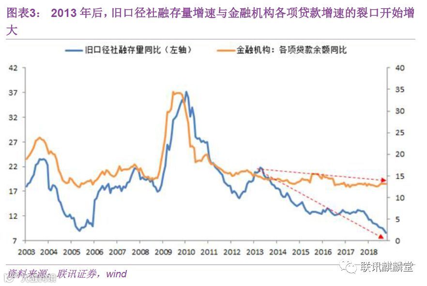 但2013年后,随着金融创新的加快,影子银行兴起,非标与债券融资对社融的影响力显著增强,贷款与社融的增速裂口增大,趋势也出现了分化,信贷存量增速变化的信号意义下滑,投资者与研究人员对它的关注度也有所下降,转而关注社融存量增速。
