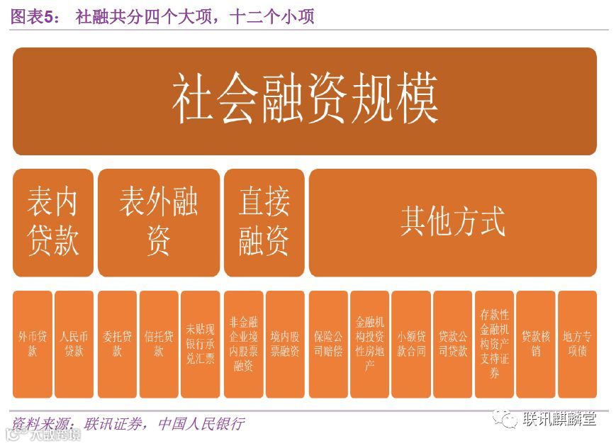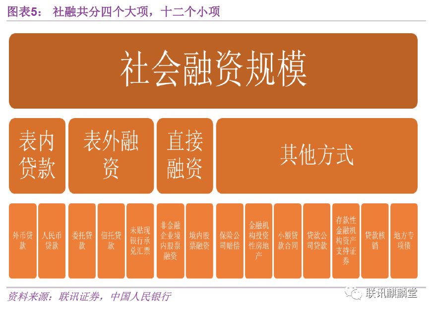 目前,社融一共包括四个大项,十二个小项,如图5所示。