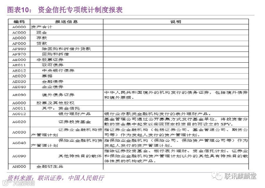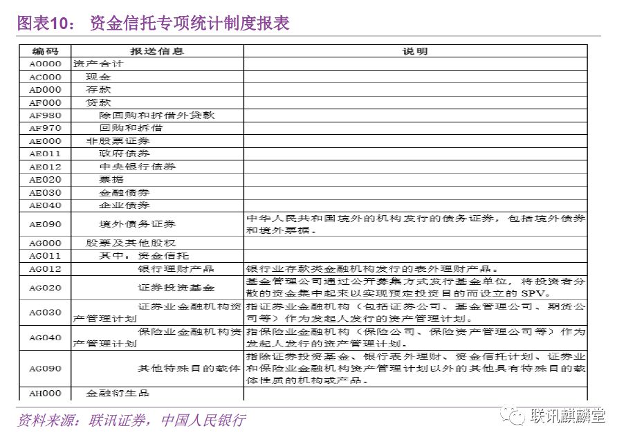 在2017年资管新规提出“去资金池”的要求后,统计制度可能会有所变动,具体不得知,我们猜测可能会把“按各资金池统计”转为“按产品统计”,整体的统计要求与框架应该会保持不变。