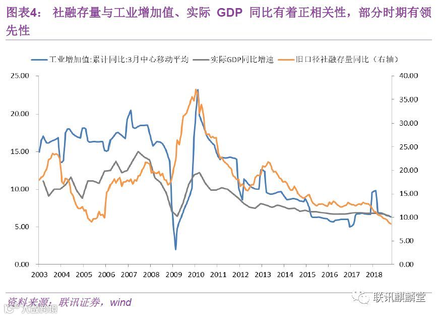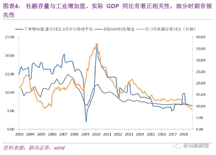 从我们估算得到的结果看,社融存量同比以2010年为界,呈现趋势上涨和趋势下行的特征,与GDP增速、工业增加值累计同比增速都有较好的相关性,在部分时期有一定的领先性。