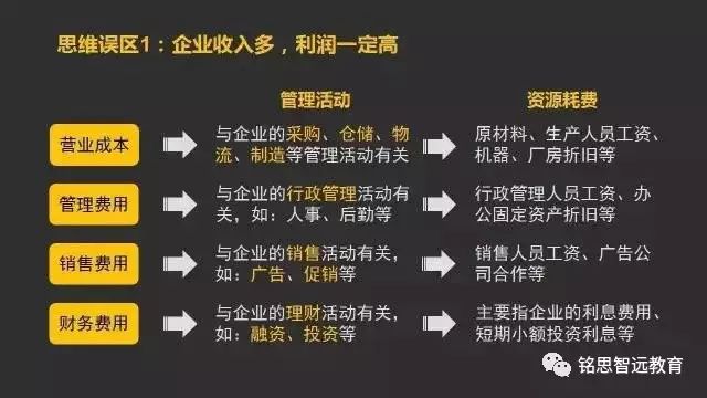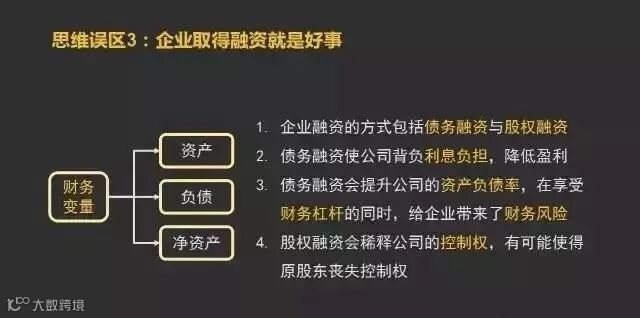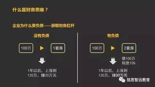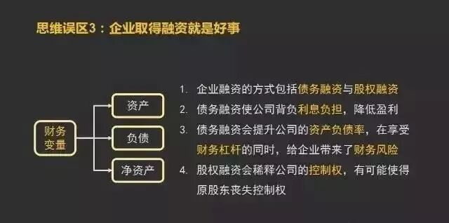 假设我们公司未来的目标是要大幅度提高公司的收入,于是公司就去为这个东西做准备,要去购置相应的资产。资产多了就会引起债务的增加。债务增加,就会有费用,可能会有一些借款费用,就会影响到利润。最后可能会使得公司资产负债率上升,同时由于债务成本特别高,公司的利润不一定会同比的上升,所以我们任何一个业务,都会影响到多个财务变量。一定要用整体性的思考方式,要用联系性的思维方式,来解决公司的业务和财务的问题,千万不可孤立的去看待任何一个变量。