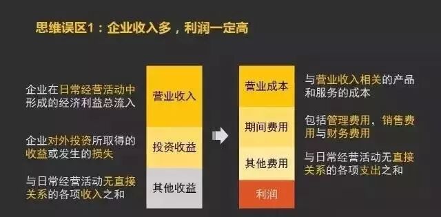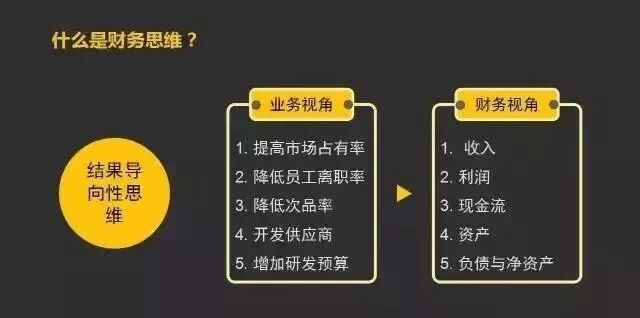 请看这张图,在这个框的左边,是业务人员的视角。业务视角讲究的是过程,但是我们财务视角讲究的是结果,因此无论有哪些业务的变量,最后都希望体现在一定的财务变量上。财务变量请看右边这个框,就是收入的上升,利润的增加,现金流变得充裕。资产质量得以提高,负债得以控制。