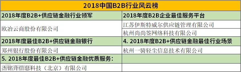 敦煌网、化纤邦、马上银、卖好车、摩贝网、木材码头、欧冶云商、奇化网、全塑联、扫IC网、铜道、我的钢铁、五阿哥、亿建联、易单网、易煤网、易塑家、优化工、找钢网、中驰车福、中国电力设备信息网、中国网库、酒仙网等企业凭借自身独特的优势,获得“2018中国B2B企业竞争力30强“的荣誉。