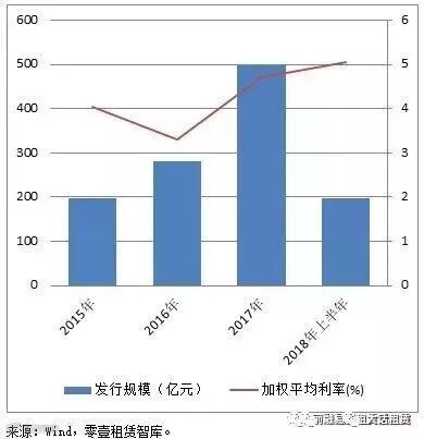 2015-2017年租赁金融债发行规模分别为197亿、280亿、499亿元,呈持续增长趋势;2016年、2017年增幅分别为42%和78%。从利率来看,从2016年到2018年上半年加权平均利率逐年递增。2017年租赁金融债加权平均利率上浮42.72%,这表明受2017年整体债市流动性变差,社会融资成本上升的影响,租赁金融债利率大幅上浮。