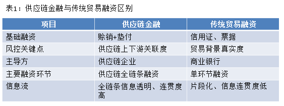 从供应链金融与传统融资模式的区别来看,主要体现在5个方面(见表1),传统贸易融资主要通过信用证以及票据,真实贸易背景下以在有效期内的信用证以及未到期的票据进行融资借款并以业务滚动方式延续借款期限,主要融资环节体现在采购或者销售的单环节部分,此时融资平台以商业银行为主。