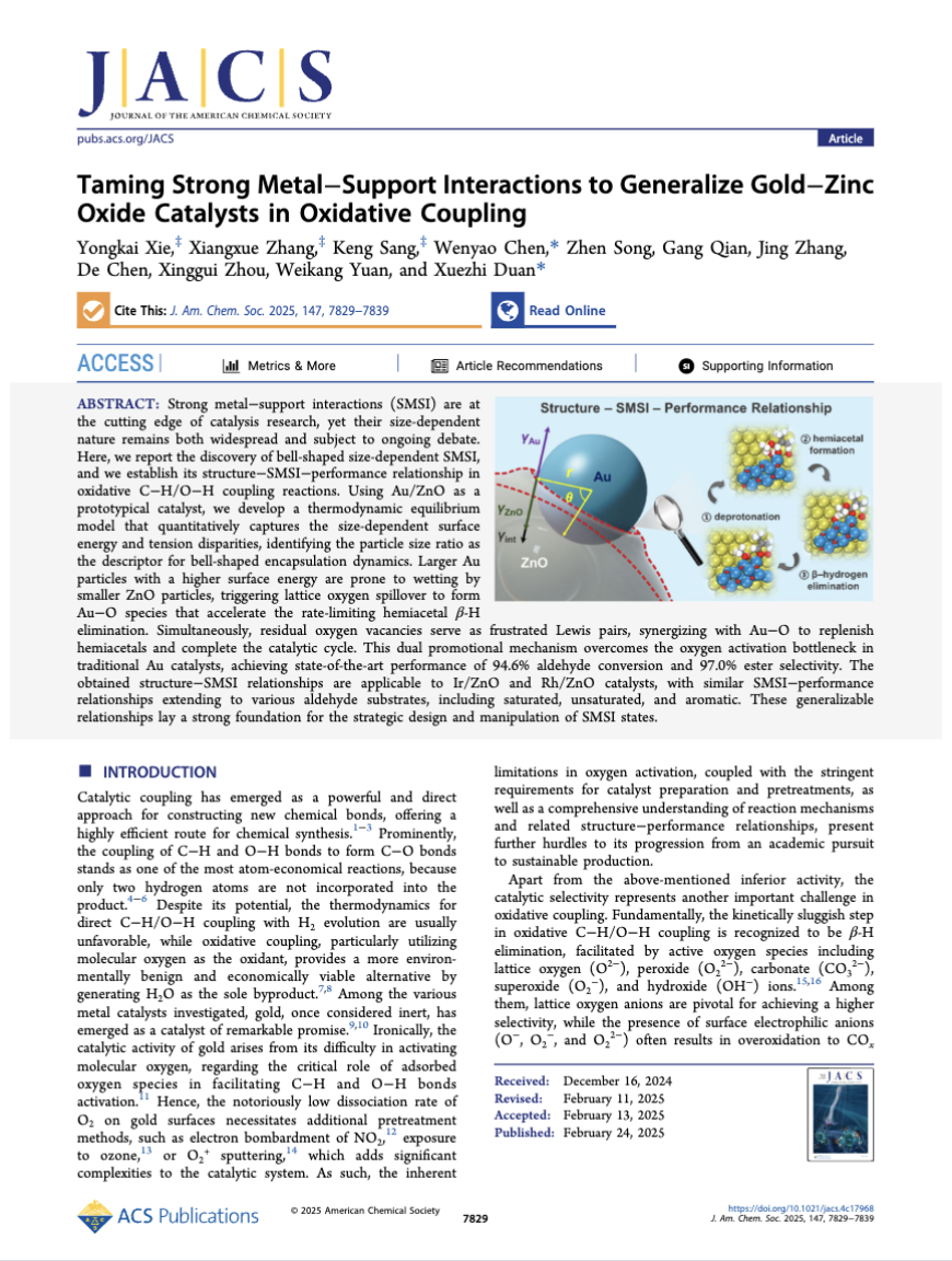 文章介绍:在催化反应中,强金属-载体相互作用(SMSI)因其对活性位点电子结构和反应微环境的深层调控作用,被认为是提升催化性能的核心机制之一。然而,尽管SMSI在许多贵金属体系中已有深入探索,关于“金属粒径如何调控SMSI强度”的问题,尤其是在金(Au)催化剂中,仍然存在广泛争议,此外,氧化偶联反应是构建C-O键的高效途径,尽管金催化剂因其独特的表面性质备受关注,但其对分子氧的活化能力不足,长期制约其工业化应用。因此,亟须系统揭示金催化剂SMSI的形成规律与结构-性能关联,以实现对其催化氧化偶联反应性能的精准调控与普适推广。研究发现,相较于传统认知中SMSI需小粒径金属的观点,适当放大的Au颗粒在与纳米ZnO载体作用时,因表面能差异驱动ZnO表面部分包裹金属,从而诱发大量氧空位及活性Au–O物种的生成。这一发现打破了金表面能低,难以形成SMSI的常规印象。基于热力学建模分析,研究团队提出金属与载体粒径比(rAu/rZnO)可作为SMSI强度的结构描述符,并发现SMSI强度呈现钟形依赖关系:当粒径比处于某一最优范围时,既可激发氧活性,又不会抑制金属活性位点暴露,达成催化性能最大化。在典型的醛-醇氧化偶联反应中,所构建的最优Au/ZnO催化剂展现出94.6%的底物转化率与97.0%的酯类选择性,明显优于多数贵金属催化剂体系。通过介观动力学研究发现,这一优异性能来自两类活性物种的协同作用机制:一方面,氧化锌晶格中的氧空位与金属界面形成受挫路易斯对,促进了醛与醇的缩合;另一方面,溢出的晶格氧生成Au–O物种,有效加速速率决速步骤—β-H消除,完成催化循环。该机制成功扩展至Ir/ZnO和Rh/ZnO体系,并在饱和醛、不饱和醛和芳香醛等不同底物上均显示出优异的催化活性与选择性。这一普适规律不仅深化了对SMSI起源与催化功能作用的理解,还为催化剂尺寸调控、界面工程设计提供了理论依据与实践指导。