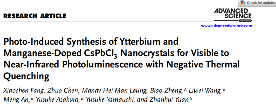福建农林大学袁占辉教授团队(生物质先进催化及功能材料团队)近日在国际高水平期刊Advanced Science(《先进科学》)和Chemical Engineering Journal(《化学工程》)上发表了标志性成果。成果一是围绕全无机钙钛矿纳米晶CsPbCl3:Mn/Yb的可见-近红外发光二极管(Vis-NIR-LED)制备和应用,提出了一种简单、高效的光诱导合成方法,利用四氯化碳作为卤素源,在室温下制备CsPbCl3:Mn/Yb纳米晶,通过Mn的发射(4T1g→6A1g)与Yb的发射(2F5/2→2F7/2)之间的能量传递关系,实现了Yb于980nm的负热猝灭发光,解决了由全无机钙钛矿纳米晶固有的低热/氧/湿稳定性和严格的合成工艺限制其实际应用的问题。近日,该论文以“Photo-induced Synthesis of Ytterbium and Manganese-Doped CsPbCl3 Nanocrystals for Visible to Near-Infrared Photoluminescence with Negative Thermal Quenching”(光诱导合成钇和锰掺杂的CsPbCl3纳米晶体用于具有负热猝灭行为的可见到近红外的荧光发光)为题发表于国际高水平期刊Advanced Science,福建农林大学为第一单位,硕士研究生方晓晨为第一作者,袁占辉教授为第一通讯作者。成果二是提出了一种简单而强大的自下而上的合成方法,采用MXene、NiCo-LDH和基的单宁冷冻凝胶,通过微波辅助水热共组装工艺制造 3D 分层交织NiCo-LDH@MT基电极。所得的NiCo-LDH@MT电极在1A﹒g-1的电流密度下表现出1210.55F﹒g-1的出色比电容,以及令人印象深刻的80.05%倍率能力,而纯NiCo-LDH电极为53.3%。使用 NiCo-LDH@MT作为正极和MXene-TPUF作为负极组装的非对称超级电容器器件在946.5 WKg-1的功率密度下表现出48.22 WhKg-1的高能量密度。此外,这些器件在10 A g-1下循环10,000次后,实现了93.2%的显着容量保持率和100%的库仑效率。基于NiCo-LDH@MT的非对称超级电容器具有出色的比电容、长期稳定性以及出色的能量和功率密度,凸显了其在储能应用中的巨大潜力。近日,该论文以“NiCo layered double hydroxide anchored on MXene/tannin carbon cryogel composite with 3D hierarchical sea urchin-like structure for asymmetric supercapacitors”(镍钴层状双羟基锚锭带有3D海胆分级结构并用于非对称超级电容器的单宁碳凝胶复合材料)为题发表于国际化工领域顶级期刊Chemical Engineering Journal,福建农林大学为第一单位,硕士研究生蓝钰玲为第一作者,袁占辉教授和赵伟刚副教授为通讯作者。