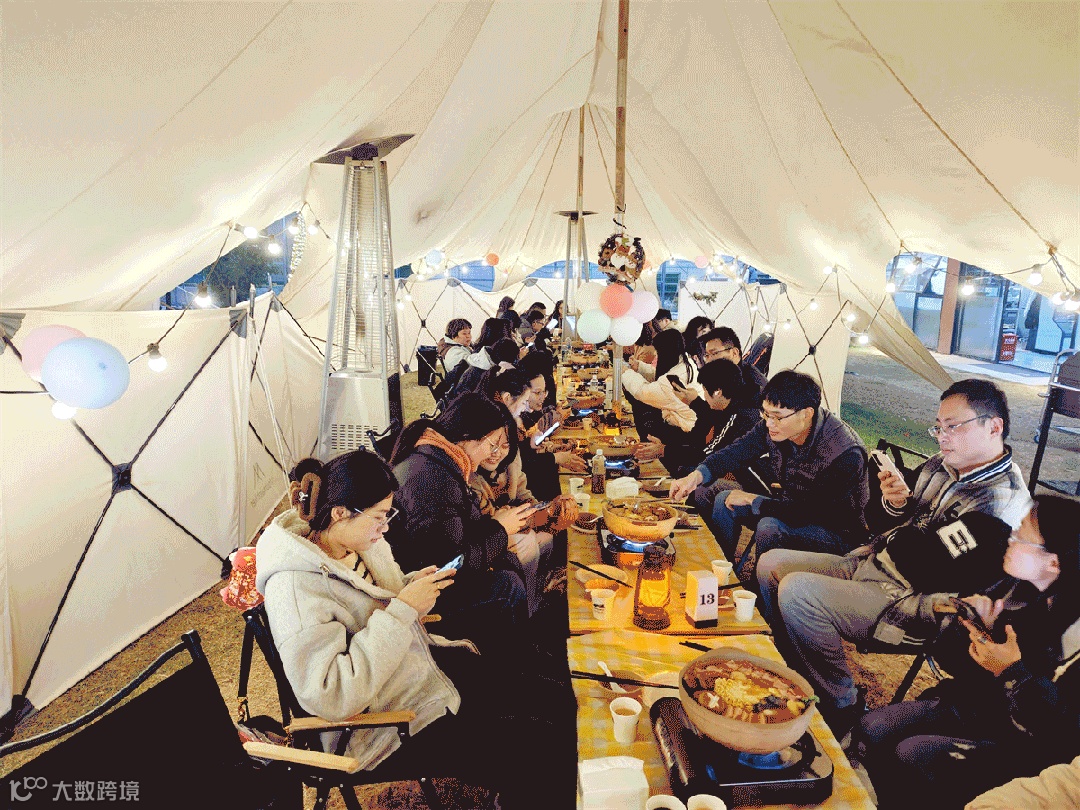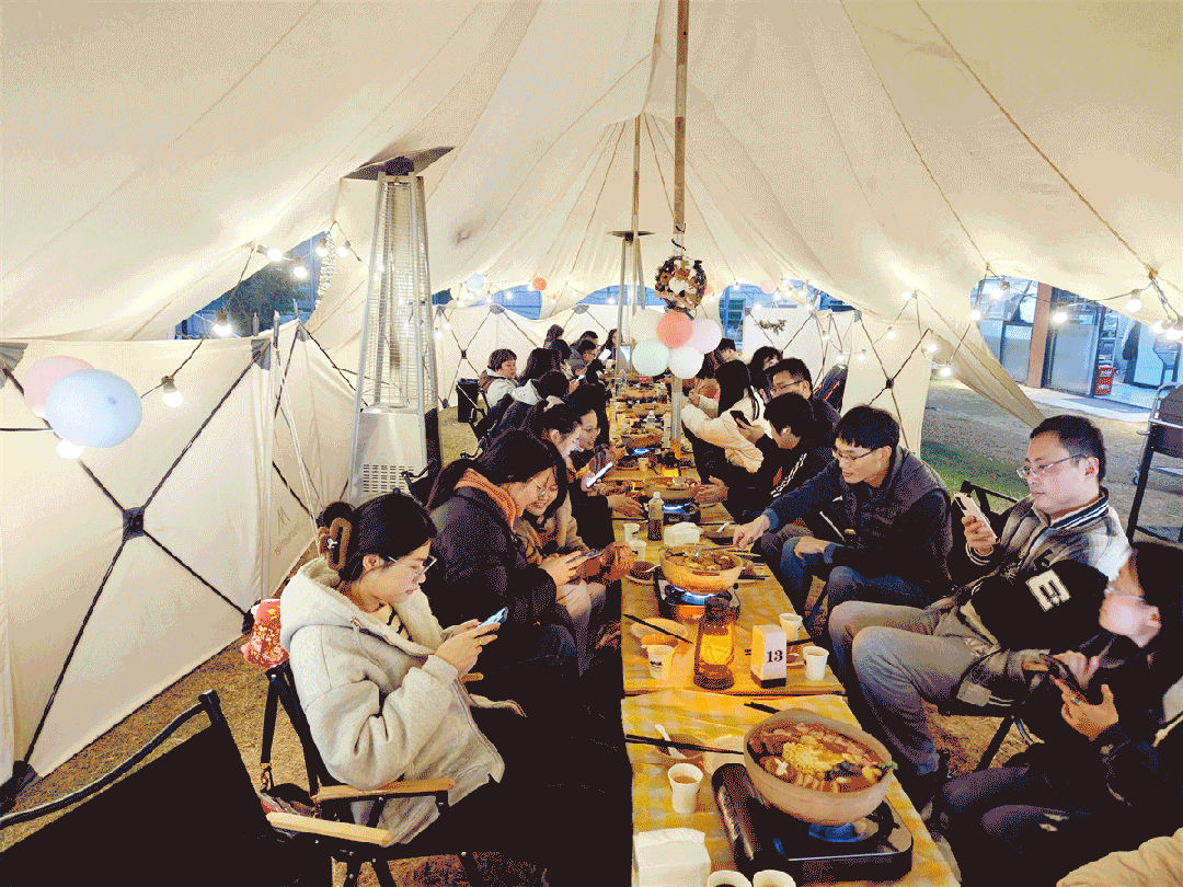 夜幕降临,大家在室外露营,围坐在一起,享受着美味的烧烤和火锅,欢声笑语不断,其乐融融。年终之际,HRBP还为大家精心准备了惊喜抽奖活动,每人都收获了一份美好的新年礼物。此外,为了最后的大奖,伙伴们积极参与游戏比拼,纷纷献出才艺,歌曲、舞蹈……精彩纷呈的表演一次又一次将现场氛围推向高潮。