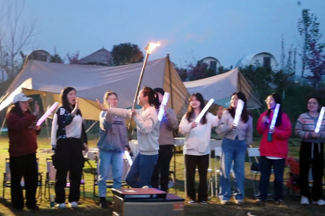 随后,传递篝火仪式开始,成都人资经理手持火把,与伙伴们一一击掌,象征着团队的热情与力量的传递,最终,火把点燃篝火,照亮每一位新时颖伙伴,让团队的团结之光熠熠生辉。