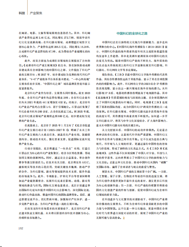 展望未来,中国科幻产业的发展前景十分广阔。一方面,人工智能、量子计算、生物技术等前沿科技的迅猛发展,将为科幻创作者提供更加丰富和多元的素材,激发更多以科技为核心的创新作品;另一方面,科幻产业的持续繁荣将推动国内文化创意产业的升级与创新,促使中国科幻成为全球科幻领域的重要力量。