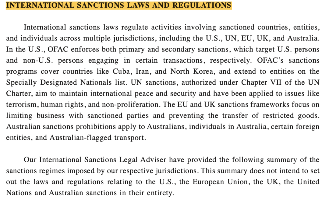 以及在监管概览章节,其国际制裁法律顾问详细介绍了有关国际制裁领域的法律法规,如多个管辖区域颁布的受制裁的国家、实体和个人清单,并逐一阐述了有关美国、联合国、欧盟、英国和澳大利亚的相关法规。