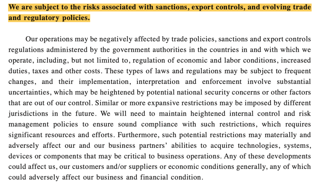例如,近期于港股上市的北京极智嘉科技股份有限公司(以下简称“极智嘉”,极智嘉是一站式仓储机器人合作伙伴,为仓储与制造场景提供高效柔性的智能物流解决方案)就在其招股书风险因素章节,披露了有关国际制裁和出口管制的相关风险:
